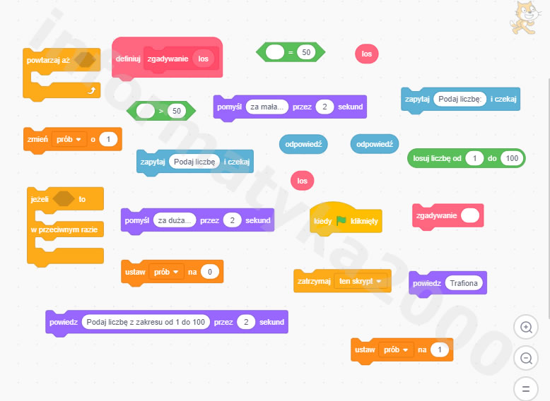 - Jeśli odpowiedź jest większa od wylosowanej liczby, wyświetlenie komunikatu Za duża., lub jeśli odpowiedź jest mniejsza od wylosowanej liczby, wyświetlenie komunikatu Za mała.
