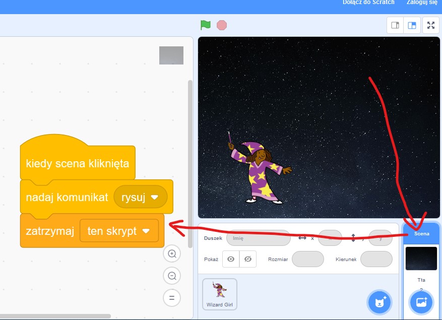 - Teraz z zakładki ZDARZENIA – wybieramy blok KIEDY SCENA KLIKNIĘTA