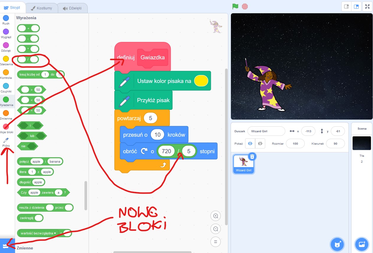 - Kolejny etap to z bloku – MOJE BLOKI – dodajemy utworzony przez nas GWIAZDKA