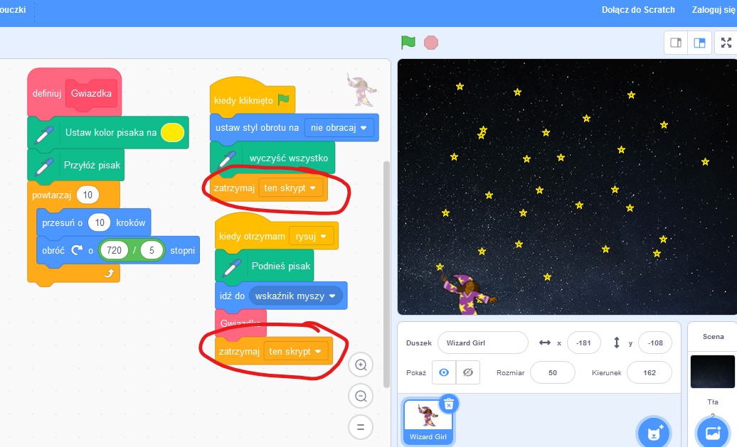 - Z nowego bloku Pióro – dodajemy: USTAW KOLOR PISAKA NA żółty – oraz PRZYŁÓŻ PISAK