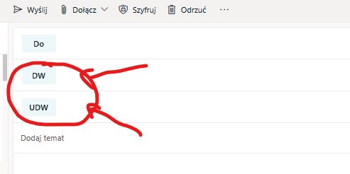 UDW – W tym przypadku wskazuje się osoby, których adresy będą widoczne oraz osoby, których adresy będą utajnione. O tym, że istnieje jakiś odbiorca UDW, wie tylko on i nadawca. Aby wysłać taką wiadomość, należy wybrać co najmniej jednego odbiorcę głównego, a następnie kliknąć UDW i w polu UDW umieścić pozostałych odbiorców.